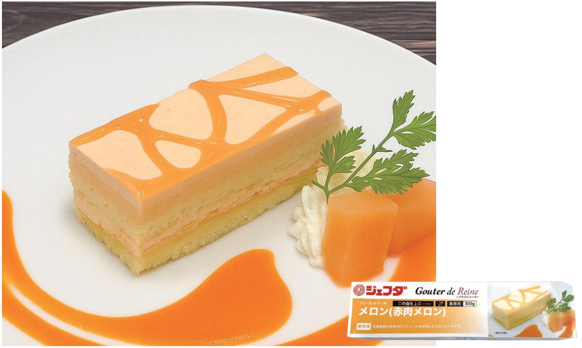 北海道産赤肉メロンの甘みと彩りを、手軽に味わえるフリーカットケーキです。北海道産赤肉メロンピューレを使用。メロンの皮模様をイメージしたナパージュで美しく仕上げました。包材に横:0.5mm 刻みの目盛り付きで、お好みのサイズにカットできます。330X78X30mm