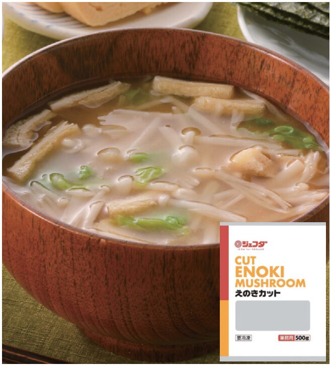 下処理不要!そのまま調理に使えるカットえのき!えのきは菌棒栽培にて育てており、品質の安定した原料を使用しております。汁物や和え物など、様々な料理に使用いただけます。IQF にて、必要な分だけご使用いただけます。カットサイズ:約2-3cm