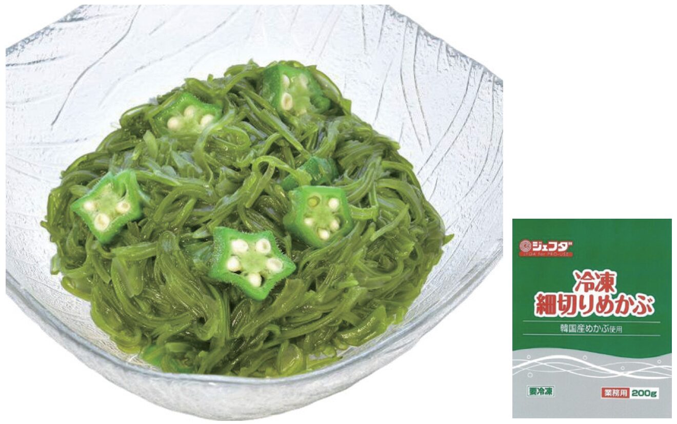 固形100%。韓国産のめかぶを食べやすい細切りに加工しました。独自のTHC 製法( 加熱・冷却) により、短時間で加熱殺菌し、緑色鮮やかなめかぶに仕上げました。