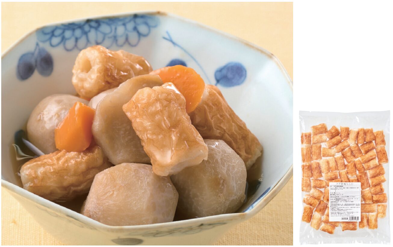 こんがりと焼目をつけた野焼ちくわです。一口サイズですので、カット不要でご使用いただけます。お弁当の小付けや、おつまみにおすすめです。約20X35mm/ 個