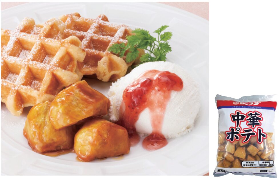 解凍だけでそのまま使える!便利で手間いらずの中華ポテトです。低温でじっくり揚げることで、さつまいも本来の甘みを引き出しています。外はパリッ、中はホクホクした食感が楽しめます。飴だれしにくく、惣菜メニューにも使えます。約60 個-70 個入り。