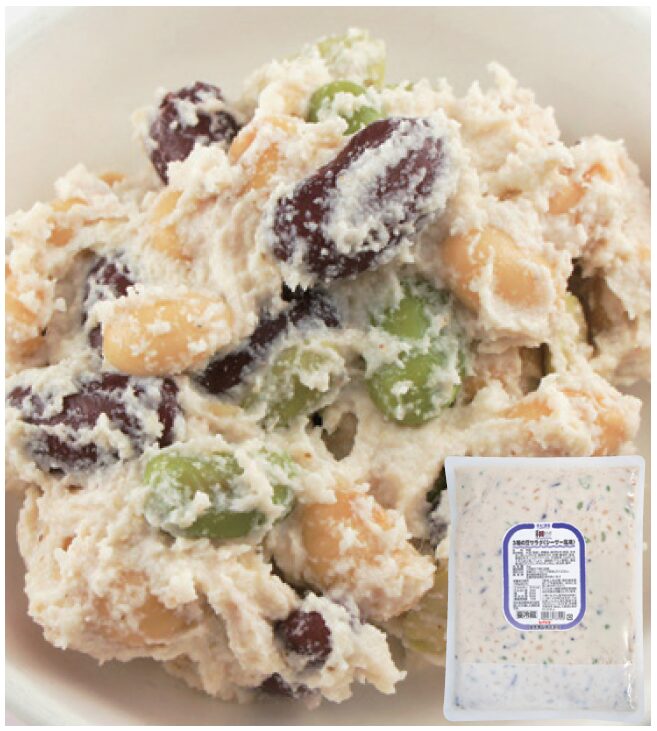 植物生まれの大豆マヨネーズで作ったシーザー風味の豆サラダです。アレルゲンは大豆のみ、3 種類の豆を使用して彩りよく、やさしい味付けに仕上げました。