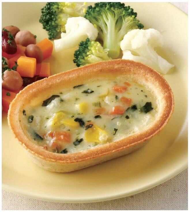 5 種類の国産野菜(じゃがいも、たまねぎ、にんじん、とうもろこし、ほうれん草)を豆乳ソースでまとめました。野菜の美味しさと具材感をお楽しみください。鉄分6.9mg/ 個、カルシウム146mg/個、食物繊維2.1g/ 個