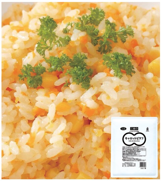 にんじんをたっぷりと使った、炊き込み用のピラフの素です。明るい彩りに仕上がるよう、具材にはにんじんの他にコーン、赤ピーマンを、ベースにはにんじん濃縮汁を加えました。にんじんの苦手なお子様にも食べやすいよう、チキンエキスをベースに味を調整しています。米3-3.5kg/P