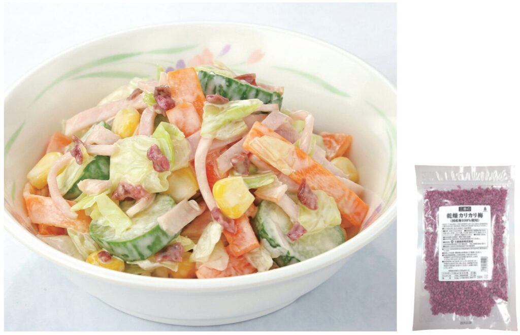 梅肉を調味し乾燥させた、さっぱり味の混ぜごはんの素です。国産の梅を100% 使用し、着色料は使用せず自然な色合いに仕上げています。梅の酸味が食欲をそそり、彩りを添えます。150gに 4-5g の割合。
