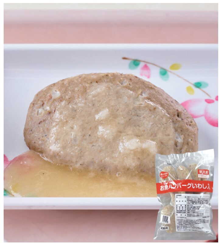 鰯とたらをベースにし、生姜の風味をきかせたソフト食感タイプのいわし入ハンバーグです。