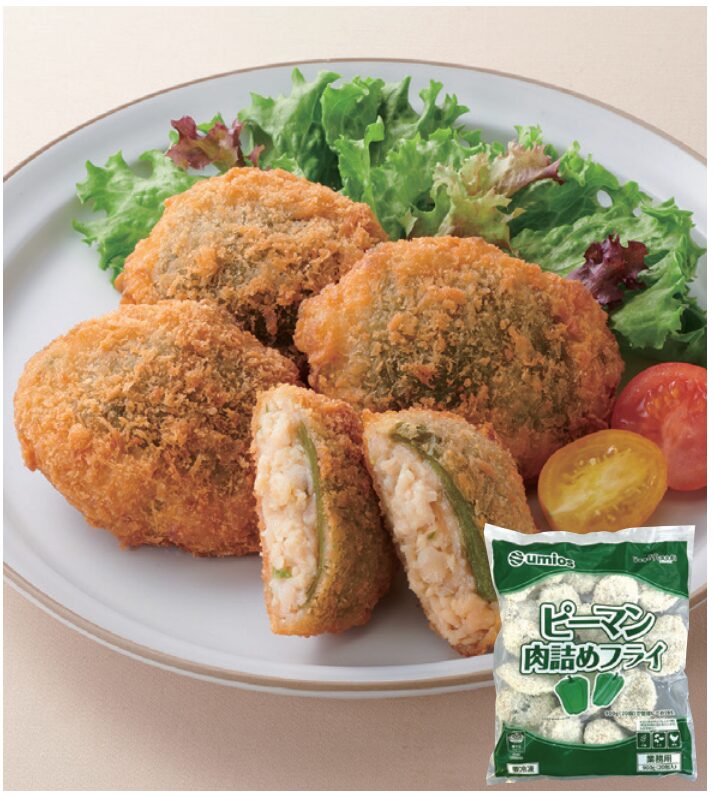 カットしたピーマンに鶏つくねを詰めたフライです。お肉本来の味を大切にしました。