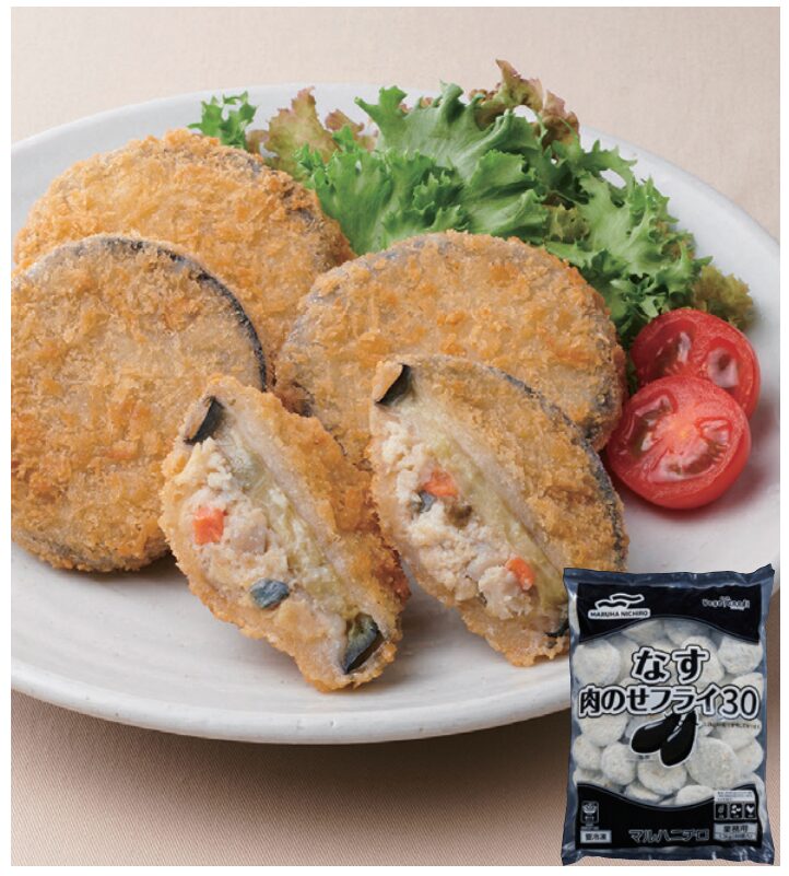 スライスした茄子に鶏つくねを乗せたフライです。野菜の素材感を感じていただける様に仕上げました。