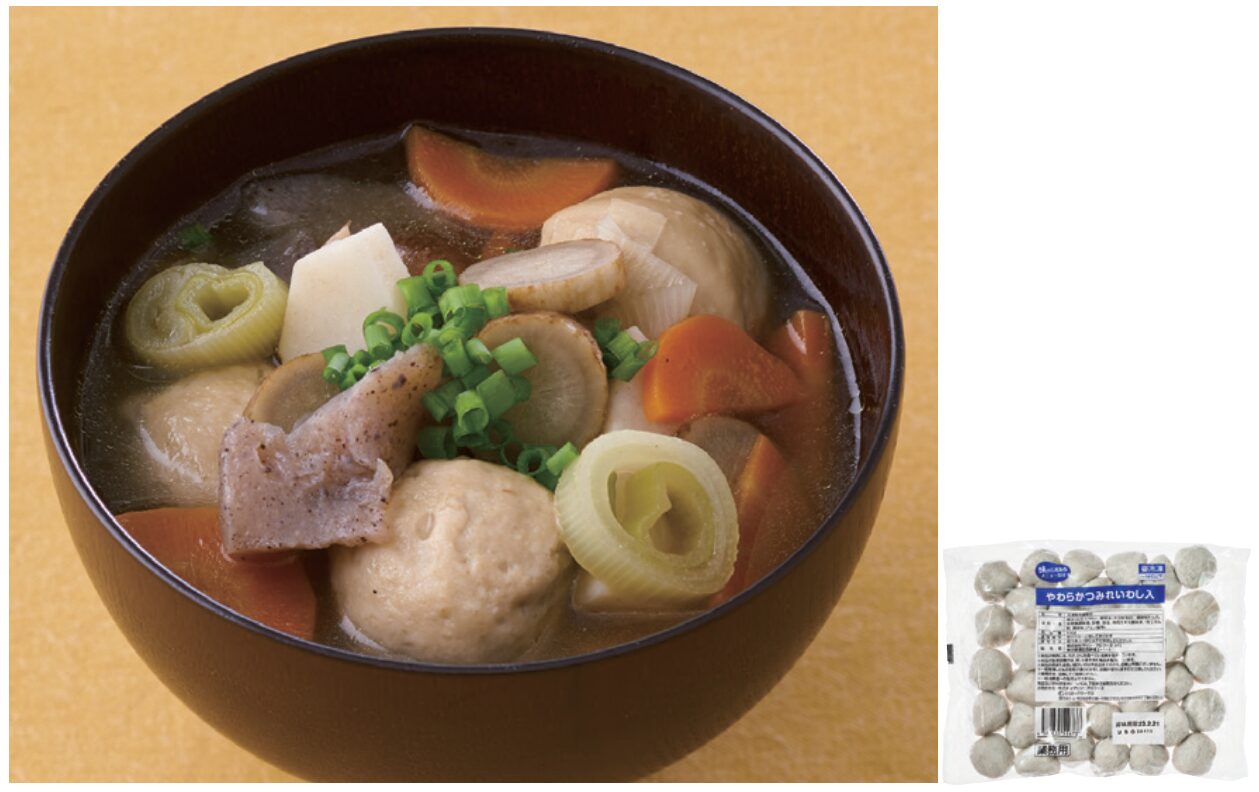 いわし落とし身とスケソウたらを合わせてソフトに仕上げた「いわし入つみれ」です。1 個約 15g。約25X35X25mm