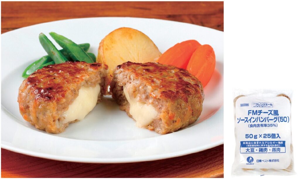 卵・乳・小麦不使用!国産鶏肉と豚肉を使用したハンバーグに、チーズ風ソースを閉じ込めました。風味も良く、時間が経っても「とろ~り」口溶けの良いソースです。1 個当たりカルシウム105mg、鉄分1.0mg