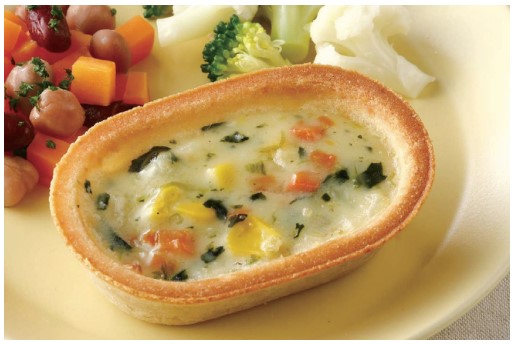 5 種類の国産野菜(じゃがいも、たまねぎ、にんじん、とうもろこし、ほうれん草)を豆乳ソースでまとめました。野菜の美味しさと具材感をお楽しみください。鉄分 4.7mg/ 個、Ca100mg/ 個、食物繊維 1.4g/ 個