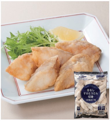 MSC 認証を取得したすけとうだらを使用した骨なしの打ち粉付け魚です。シンプルな下味付きで、様々なメニューにご使用頂けます。しっとりとした食感を生かしつつ、ほろっとほぐれる食感 にこだわって仕立てました。