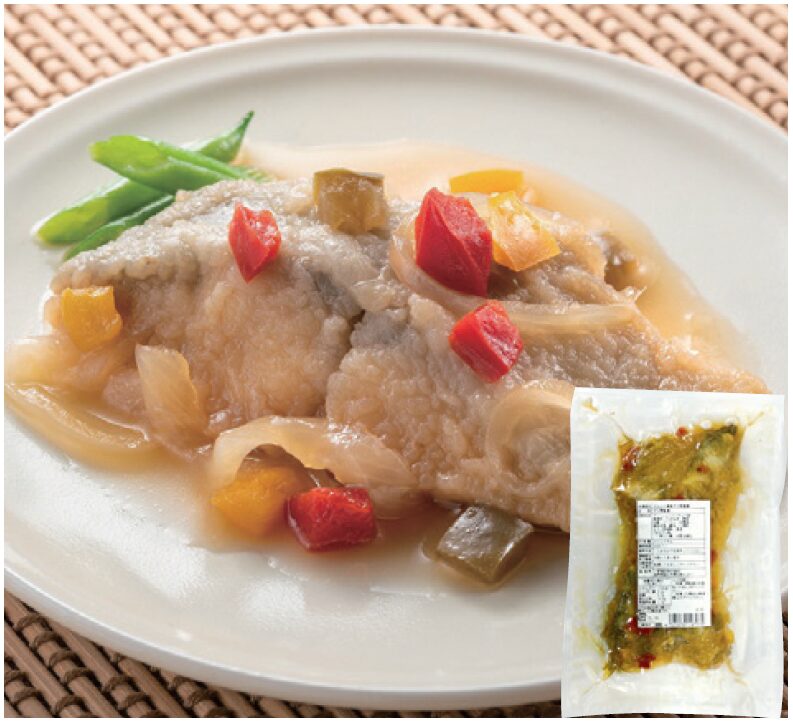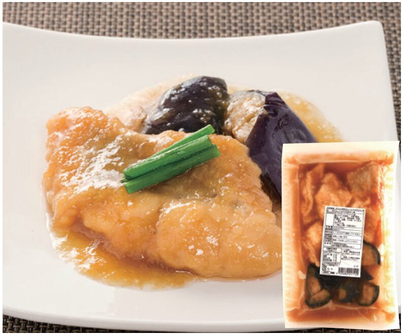 粉付けし、揚げたカレイとナスを生姜の効いたおろしダレで仕上げました。魚:5 切、揚げナス:10 個の仕様です。