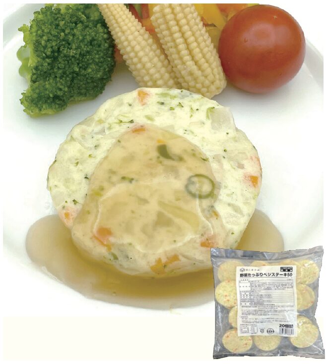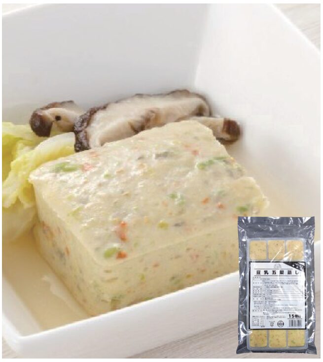 豆乳に卵とすり身を加えて煉り合せた舌触りの良いなめらかな食感の生地に刻んだ野菜を入れて彩り良く仕上げました。ご年配の方におすすめです。