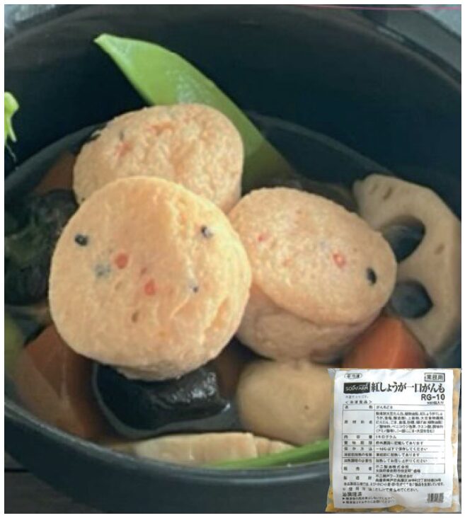 彩り鮮やかな紅しょうがを中心ににんじん、ごまの入った一口サイズのがんもです。わずかな時間で味がしみ込み、煮くずれもない、使い勝手の良いがんもです。本品を冷凍のまま、和風味につけただし汁で煮含めてください。筑前煮、おでんなどにご利用いただけます。