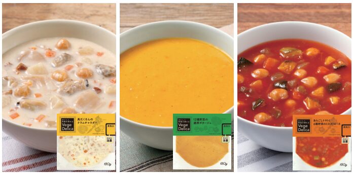 VegeDelica スープ各種 具だくさんのクラムチャウダー・12種野菜の濃厚ポタージュ・あらごしトマトと6種野菜のミネストローネ