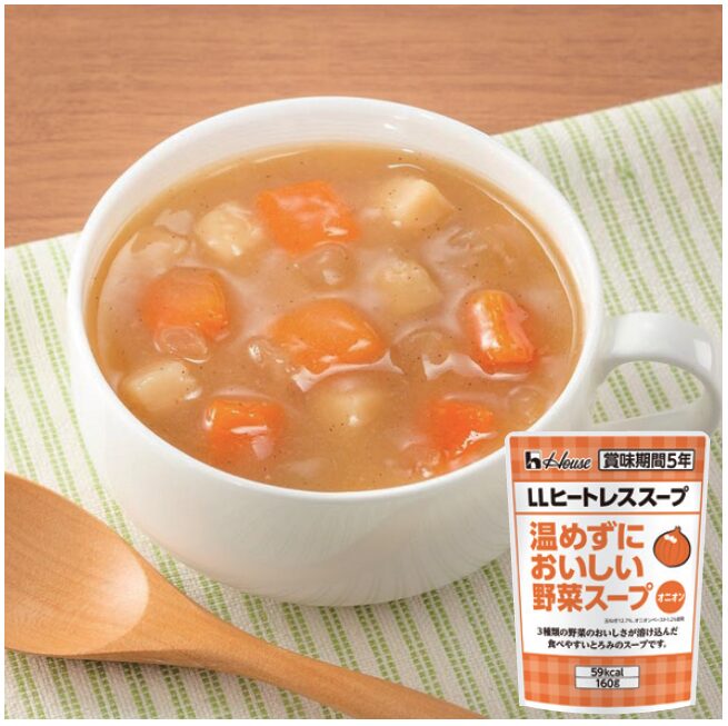 常温で5 年間備蓄いただける製品です。アレルゲン28品目不使用で、災害時に不足しがちな野菜を多く含んでおり( 生換算50g の野菜使用)、温めずにおいしく召し上がっていただけます。スタンディングパウチを採用しており、災害時には器の代わりとなるため洗い物などを減らせます。