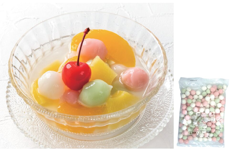 赤・緑・白の素甘だんごを1kg 袋にミックスした商品です。赤色が”春”、緑色が”夏”、白色が”冬”を表しており、「秋」がないので「あきない」⇒「飽きのこない」お団子という意味を込めて名付けました。自然解凍でご使用いただける商品ですが、加熱しても色落ちしにくいため加熱調理にも対応しています。1 粒あたり約7g。
