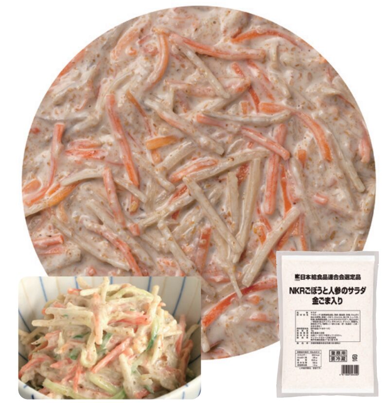 ごぼうは盛りつけやすさを重視したサイズ ( 長さ 30mm、幅 2mm)にカットし、にんじんの配合で彩りよく、すりごまで和える事により風味よく仕上げました。野菜を加えてアレンジも可能です。