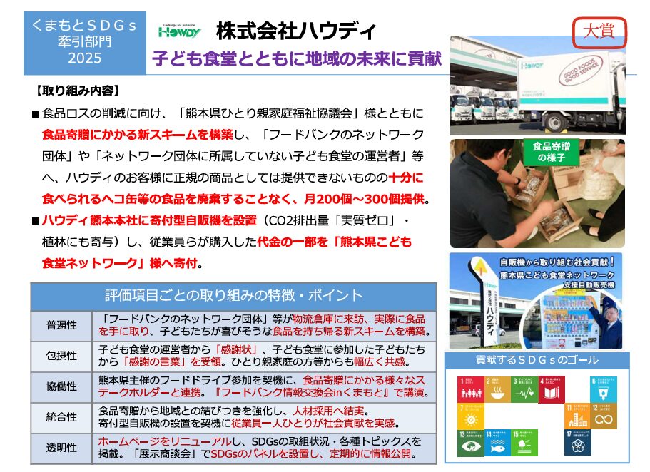 同アワードは、熊本県のSDGs(持続可能な開発目標)達成に向けた優れた取り組みを顕彰するものです。